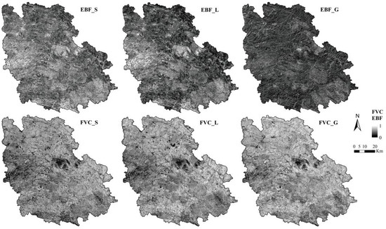 FVC and EBF information extracted from three image data (“S”, “L”, and “G” represent the remotely sensed indexes extracted from Sentinel-2B, Landsat-8, and Gaofen-6, respectively. For example, the “EBF_S” represents the EBF result generated by the Sentinel-2B image.).