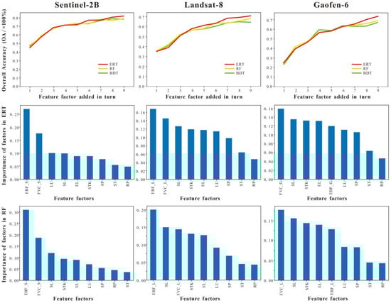 The importance of factor and its relationship with classification accuracy (“S”, “L”, and “G” represent three types of images of Sentinel-2B, Landsat-8, and Gaofen-6. Since the BDT model cannot determine the importance of factors, it adds feature factors in turn according to the addition order of the ERT model).