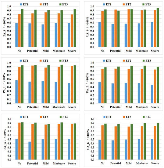Producer’s accuracy (PA) and user’s accuracy (UA) for extraction results of different levels of rocky desertification (“S”, “L”, and “G” represent three types of images of Sentinel-2B, Landsat-8, and Gaofen-6.).