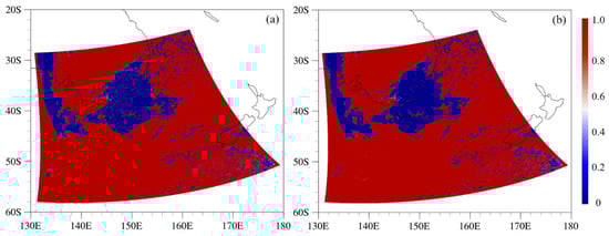 By applying the method with the ancillary and auxiliary data as described in Section 2 and running the operational ECM package using the S-NPP VIIRS reprocessed SDR data as input, we have produced the reprocessed ECM for the period from 1 April 2018 to 11 March 2020. The retrieved cloud properties in the ECM products include four cloud mask types (clear, probably clear, probably cloudy, cloudy), and cloud probability (0.0–1.0). In this preliminary study, we investigated the differences between the operational and reprocessed ECM products for the selected day on 1 May 2018 and chose six granules for detailed comparisons in the cloud mask types and cloud probability. These six granules are located close to the southeast corner of Australia and were chosen under the considerations to (1) avoid the Antarctic region (60S~90S), because the accuracy of ECM in high latitudes (>60o) is less than that between 60S and 60N [26], and (2) include both land and ocean surfaces. There are 14,745,600 pixels included in the six granules on 1 May 2018.