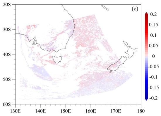 Cloud probability for (a) the operational and (b) the reprocessed ECM products for six granules on 1 May 2018. (c): pixels that have different cloud probability between the operational and reprocessed ECM products. The pixel is color-coded based on the difference between the probability of the reprocessed and operational ECM products.