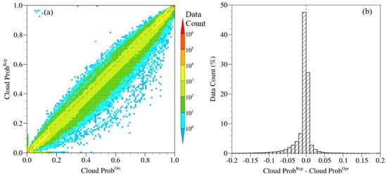 Examination of the cloud probability of the reprocessed ECM product with respect to that of the operational ECM product for the mismatched pixels (Figure 4a) shows that, for the majority (67.3%) of the mismatched pixels, the cloud probability of the operational ECM product is larger than that of the reprocessed ECM product. In addition, 98.92% (1,082,674 out of 1,094,450) of the mismatches have a difference in cloud probability of less than 0.1, and 99.93% (1,093,666 out of 1,094,450) of the mismatches have a cloud probability difference less than 0.2 (Figure 4b).