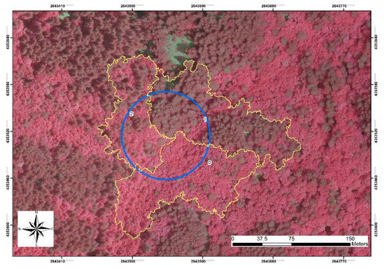 Example of validation sample (EPSG 3004). The limits of the sample and the circular plot are in yellow and blue, respectively. The codes 0, 1, 2 refer to the classes reported in Table 3.