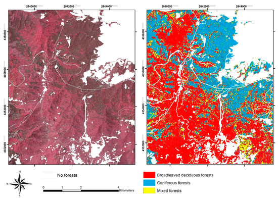 On the left, VHR aerial image (infrared false color) of the study area where “no forest” is highlighted in white and on the right, the map of forest areas covered by coniferous, broadleaves and mixed stands (EPSG 3004).