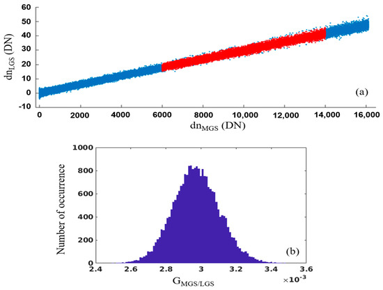 (a) Scatter plot of dnLGS and dnMGS collected during a NOAA−20 VROP between 8:38 and 8:54 UTC on 8 October 2018. The red part is used for GMGS/LGS determination. (b) Histogram of the gain ratios calculated by the selected pairs of dnLGS and dnMGS [the red part in (a)] using Equation (6a). Data for aggregation mode 21 and detector 9 are shown.
