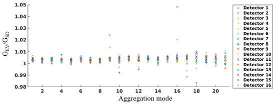 Figure 5 shows the ratios between the prelaunch LGS EV and SD gains for all 21 aggregation modes. The ratios are close to unity for many aggregation modes and detectors. However, outliers are found in several aggregation modes. The typical examples are detectors 1 and 16 of aggregation modes 9 and 16. Their EV gain values are underestimated by the SD gain values by up to 5%. There are a few detectors and aggregation modes whose EV gain values are overestimated, which are detectors 1 and 16 of aggregation mode 10, detectors 1 and 16 of aggregation mode 12, detectors 1 and 16 of aggregation mode 17, and detector 1 of aggregation mode 18. These outliers suggest non-negligible discrepancy between the LGS EV and SD radiometric responses for a few aggregation modes and detectors. The underestimated or overestimated EV gain values consequently induce either negatively or positively biased radiance values, resulting in dark or bright streaks in NOAA-20 VIIRS DNB imagery. Our analysis of the striping pattern shown in Figure 2a confirmed that those dark and bright streaks are due to the abovementioned detectors and aggregation modes. In particular, the absolute amount of the underestimated EV gain values of detectors 1 and 16 of aggregation modes 9 and 16 are greater than the absolute amount of the overestimated EV gain values of other mentioned detectors and aggregation modes, as illustrated in Figure 5. The dark streaks are much clearer than the bright streaks show in Figure 2a.