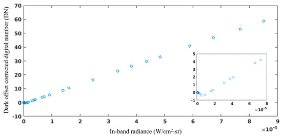Equation (6) represents the central analytic expressions for the original method to determine the MGS and HGS gains. They are derived using the DNB’s linear calibration model Equation (1) which is forced to pass through the origin. In general, the model is applicable for the dynamic range of each gain stage as a whole. The calibrated DNB radiances meet the uncertainty requirement [17]. However, the dynamic range of each DNB’s gain stage spans several orders of magnitude. The model fails to accurately characterize local radiometric response in the lower part of the dynamic range. Detector 4/aggregation mode 21 of NOAA-20 VIIRS DNB LGS is known with non-negligible nonlinearity. Figure 6 shows its radiometric response evaluated at different low radiance levels during the prelaunch test. Although the response curve is generally linear, a scrutiny of the curve near the origin indicates that nonlinear response at extremely low radiance level shifts the linear response curve so that it does not pass through the origin. A linear equation that allows nonzero constant term c0 is more appropriate to model detector’s radiometric response under such circumstance, i.e.,