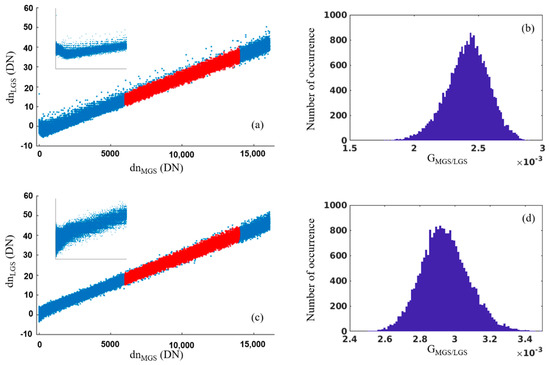 (a) Scatter plot of dnLGS and dnMGS collected by a NOAA-20 VROP between 8:38 and 8:54 UTC on 8 October 2018, for aggregation mode 21 and detector 4. The inset shows the data points near the origin. (b) Histogram of the gain ratios calculated by the selected pairs of dnLGS and dnMGS [the red part in (a)] using Equation (6a). (c) Scatter plot of dnLGS and dnMGS collected by a NOAA-20 VROP between 8:38 and 8:54 UTC on October 8, 2018, for aggregation mode 21 and detector 6. The inset shows the data points near the origin. (d) Histogram of the gain ratios calculated by the selected pairs of dnLGS and dnMGS [the red part in (c)] using Equation (6a).