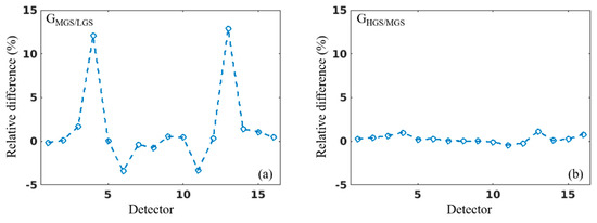 The prelaunch LGS EV gain was determined by a linear fit of the test data whose radiances were less than the LGS’s maximum radiance and greater than the radiance when the stage transition from MGS to LGS occurs [17]. Because of no constant term in the operational linear calibration model for the DNB (Equation (1)), the linear fit was set to pass through the origin. Another version of the prelaunch LGS EV gain by a linear fit allowing nonzero constant term was also derived for the purpose of comparison. Their relative difference, shown in Figure 4, is less than 0.1% for most of the aggregation modes and detectors, while the differences of the rest are less than 0.3%. Therefore, the calibration model given in Equation (1) is appropriate for the DNB LGS. Considering the negligible impact of such a slight difference on the specified DNB calibration uncertainty, which is 5–10% for the LGS, 10–30% for the MGS, and 30–100% for the HGS [21], the version of prelaunch LGS EV gain obtained by the linear fit without constant term was adopted in this paper. In order to simulate the on-orbit calibration using the SD, a specific dataset of the test, whose output radiance within the LGS spectral range is similar to the in-band solar radiance when the LGS views the Sun via the SD on orbit, was selected to calculate the prelaunch LGS EV gain, using an equation similar to Equation (2).