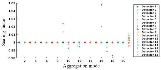 where the scaling factor Sprelaunch is the ratio of the prelaunch LGS EV and SD gain (GEV/GSD) for a given aggregation mode and detector. It can be seen from Figure 5 that the ratios of only a few aggregation modes and detectors differ from one. Their LGS gain coefficients were rescaled by the values of the ratio while the scaling factors are set to be one for the rest of the aggregation modes and detectors. It is worth mentioning that the relatively wide spread of values of GEV/GSD among detectors is observed for aggregation mode 21 that occupies about 30% of a NOAA-20 VIIRS DNB image. Considering that a small variation among detectors may be magnified in this large aggregation zone, we rescaled the LGS gain coefficient of all detectors of aggregation mode 21 as well. The scaling factors for updating the NOAA-20 VIIRS DNB LGS Gains LUT are shown in Figure 9.