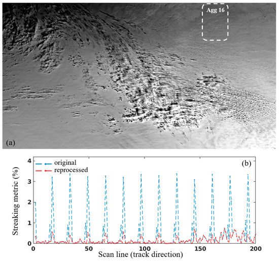 where is the average radiance of the ith scan line of a given aggregation zone. The maximum streaking metric value has been reduced from about 3.5% in the original image to about 0.5% in the reprocessed image. As noted in [42], streaks become apparent in a homogeneous unaltered image when its streaking metric is around 0.25%. The streaking metric of our reprocessed image is close to this threshold, suggesting the effectiveness of the updated LGS Gains LUT.