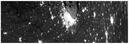 Reprocessed NOAA-20 VIIRS DNB nighttime image recorded over the Midwestern United States at 8:56 UTC, 24 October 2018. The 288 × 864 (track × scan) pixels are in the upper right side of the granule. The updated NOAA-20 VIIRS DNB LGS Gains LUT and the NOAA-20 VIIRS DNB Gain Ratios LUT created by the linear regression method were used for reprocessing.