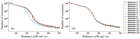Histogram of the radiances of aggregation zone 21 of the NOAA-20 VIIRS DNB nighttime granules collected between 8:50 UTC and 9:10 UTC, 24 October 2018. (a) The nighttime imagery was created by the original NOAA-20 VIIRS DNB Gain Ratios LUT. (b) The nighttime imagery was created by the updated NOAA-20 VIIRS DNB Gain Ratios LUT.