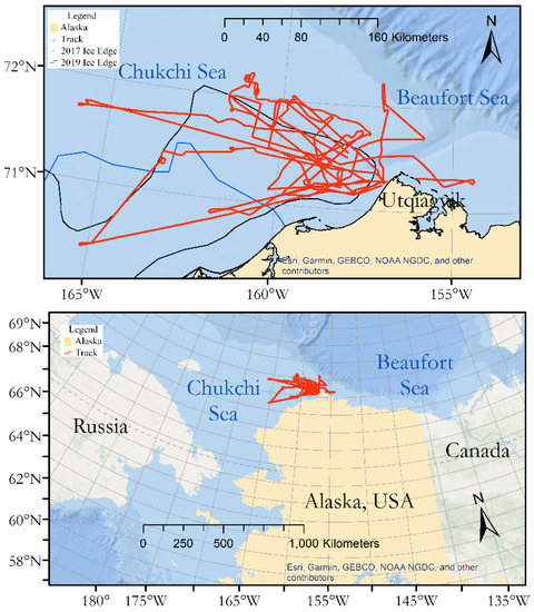 One of the most surprising features of this investigation was that the ice extent in the survey area was actually less in May 2019 than it was in July 2014 (see Figure 1). This is consistent with an overall decrease in Arctic sea ice between 2014 and 2019. For example, the minimum ice extents for those two years were 4.58 × 106 km2 and 3.91 × 106 km2, which is a decrease of 14.6% in two years [38]. This decrease is much greater than the long-term trends discussed in the Introduction, and it reflects inter-annual variability more than a long-term trend.
