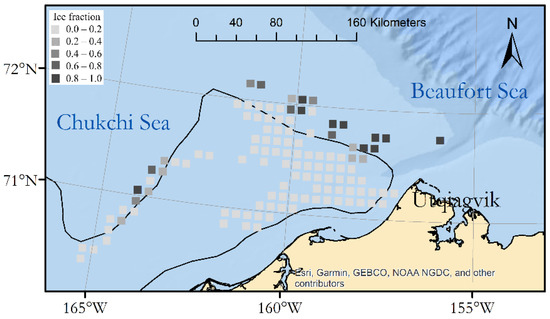 The binned ice fractions from the lidar (Figure 2) show a pattern similar to the satellite ice edge in Figure 1. There is a large region of mostly clear water west of Utqiaġvik, with ice farther west and to the north. No lidar measurements were made in the land-fast ice along the shore, because there were no holes in this ice through with the lidar could penetrate. Note that there are some differences between the satellite-derived ice edge, which was observed on one day in the middle of the survey period, and the lidar ice cover, which was spread out over several days.