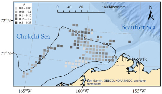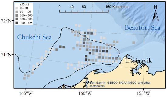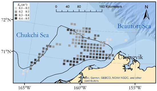 The binned diffuse attenuation data (Figure 3) show a different pattern. The largest values were found just off the land-fast ice to the southwest of Utqiaġvik. Overall (before binning), Kd was negatively correlated with ice fraction (R = −0.17, P < 10−8).
