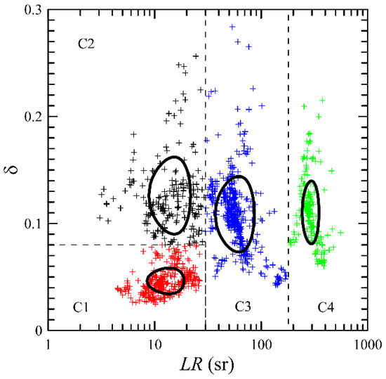 The scatter plot of depolarization vs. lidar ratio (Figure 7) shows the four clusters that were identified visually. These were defined by: cluster C1 with LR < 30 and δ < 0.08, cluster C2 with LR < 30 and δ > 0.08, cluster C3 with 30 < LR < 180, and cluster C4 with LR > 180. Each cluster is plotted in a different color. The heavy black lines denote the one standard deviation contour. The mean and standard deviation of each cluster lidar ratio and depolarization were: cluster C1—(13.7 ± 5.2, 0.046 ± 0.012), cluster C2—(15.3 ± 6.5, 0.126 ± 0.036), cluster C3—(61.6 ± 24.6, 0.109 ±0.035), and cluster C4—(96.53 ± 53, 0.110 ± 0.029).