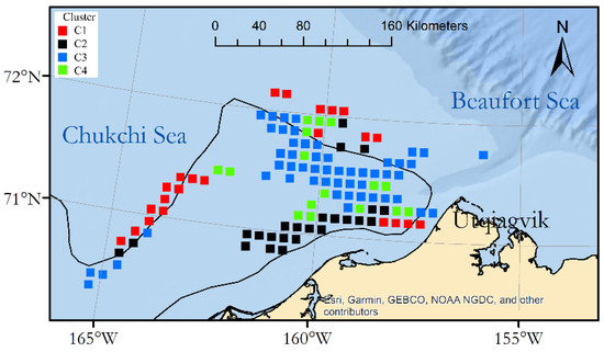 The spatial distribution of clusters (Figure 8) shows that cluster C1 was dominant in the broken ice to the west and north, cluster C2 was dominant along the edge of the land-fast ice, cluster C3 was dominant in open water, and cluster C4 was scattered geographically.