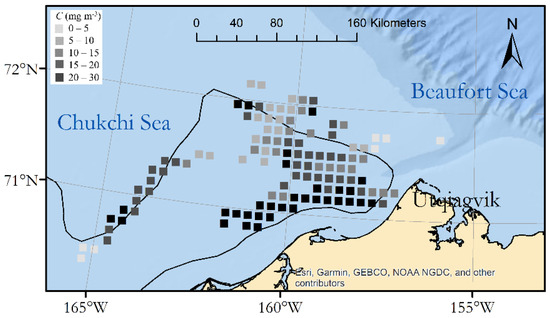 Binned chlorophyll concentration, C, calculated from Kd using Equation (1). The black line is the satellite-derived ice edge from the middle of the survey time.