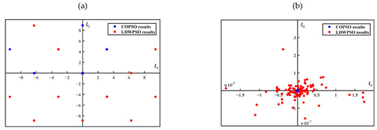 For the descending trend of different inertia weights shown in Figure 1, when the initial value of chaos , the weight (with respect to COPSO) shows a dynamic variation throughout the iterations, which meets the requirements for dynamic values of , while represents the linearly decreasing weight.