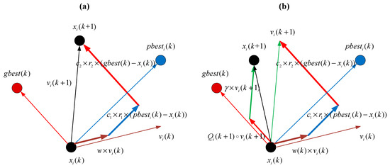 Graphical illustration of the different algorithms: (a) basic PSO algorithm; (b) improved PSO algorithm.