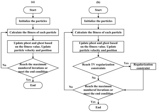 We show the flow charts of the COPSO and the TV-regularization-based improved particle swarm optimization (TVIPSO) algorithm in Figure 5.