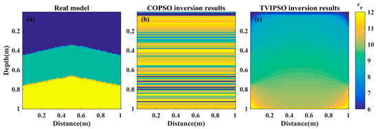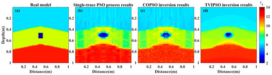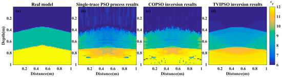 As shown in Figure 6a, the size of the model is set as . Two fluctuated interfaces are specially designed at depths of 0.4 and 0.7 m. The relative permittivity levels of the three layers are set as 6.0, 9.0, and 12.0, respectively, while the conductivity of the background medium is set as 1 . The common offset gather (COG) function of the GPR simulation is performed using the FDTD method based on the unsplit-field convolutional perfect matching layer (UCPML) [64]. The grid interval is set as 0.01 m and the Blackman–Harris pulse with a central frequency of 900 MHz is used for forward calculation. The sampling interval and the time window are set as 0.04 and 16 ns, respectively. The trace interval is set as 0.01 m and a total of 100 traces are recorded. As the PSO algorithm is essentially an inversion algorithm that does not require the specific frequency, it is suitable for GPR inversion applications with different frequencies. The TVIPSO algorithm can also be adapted to on-ground GPR simulations of different frequencies.