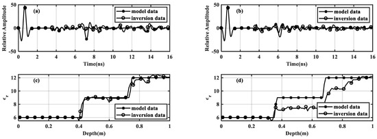 Comparison of the model data and inversion data regarding the relative amplitude and dielectric permittivity: (a,c) for the 13th trace; (b,d) for the 45th trace.