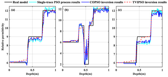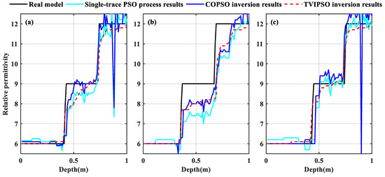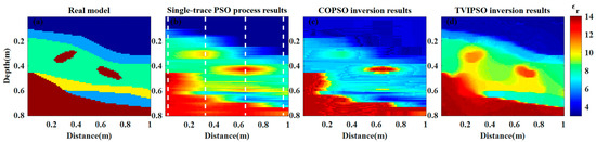 According to step 2.5, the trace-combined initial model is constructed, which is shown in Figure 9b. Then, this initial model is employed as one of the initializing particles to perform the COPSO inversion and the TVIPSO inversion. The maximum number of iterations is set as 300, the number of particles M is set as 30, and the other parameters remain the same. Figure 9c,d show the inversion results for the two algorithms. The detailed dielectric permittivity inversion curves at three horizontal positions (i.e., at distances of 0.16, 0.56, and 0.94 m) are further expatiated and are plotted in Figure 10.