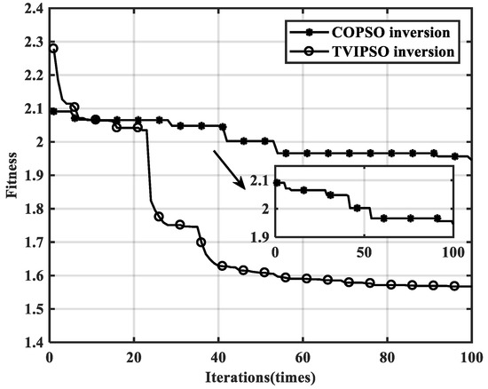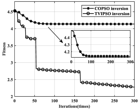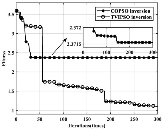 Convergence curves of the fitness functions for COPSO inversion and TVIPSO inversion algorithms.