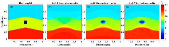 where the first term is the L1 norm of the gradient of model parameter , which is the particle that satisfies the TV regularization constraint during the iterations (i.e., the relative permittivity of the model); the second term is the fidelity term, , which is the regularization factor. In this study, for the constraint condition, the global maximum point does not change within 10 iterations.