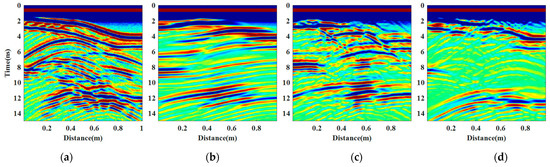 Ground-penetrating radar (GPR) involves electromagnetic (EM) signals with high resolution and has great promise for various engineering and subsurface mapping applications [1,2,3,4,5,6]. The finite difference method is a kind of differential equation method, which uses the difference equations of variable discrete and finite unknown quantities to solve continuous variables. In the past decade, the finite difference time domain (FDTD) method has developed into the most widely used and efficient algorithm for GPR forward modeling [7]. Yee [8] used the FDTD method to simulate the EM field and originated the initial concept of Yee’s space grid method. The monograph published by Taflove [9] gave a detailed explanation of FDTD numerical simulation. Teixeira [10] integrated the advantages of both FDTD and finite element time domain (FETD) methods to solve the Maxwell equations for complex model cases. Cassidy and Millington [11] employed the FDTD simulation technique to evaluate the subtle characteristics in the time frequency spectra of reflected EM signals in magnetically lossy media.
