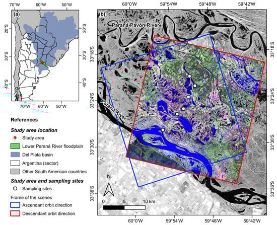 Study area at the Lower Paraná River floodplain. (a) Location in the Del Plata basin and the Lower Paraná River floodplain. (b) Sampling sites. A RADARSAT-2 scene acquired on 6 February 2018 is shown (FQ 2, Pauli representation: R = ; G = ; B = ); with a Landsat 8-OLI background scene (near infrared band in grayscale), acquired on 19 January 2018.