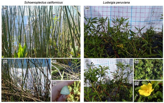 Representative photographs of the sampled targets and dominant species: Schoenoplectus californicus and Ludwigia peruviana. For Schoenoplectus: (a,b) two of the sampled sites, with vertical and tilted stems, showing some accompanying species in (a) and the presence of dry stems in (b); (c) top view of a Schoenoplectus site, showing the presence of water; (d) stem cross-section, with high proportion of aerenchyma. For Ludwigia: (e,f) two of the sampled sites, with vertical and tilted stems, and broad leaves; (g) top view of a Ludwigia site, showing the presence of water; (h) detail of flower and leaves. In subfigures (a,b,e,f), a 150 cm × 100 cm grid was used: space between magenta lines was 5 cm and space between cyan lines was 25 cm. Grid colors were chosen to contrast vegetation. See the electronic version for color images.