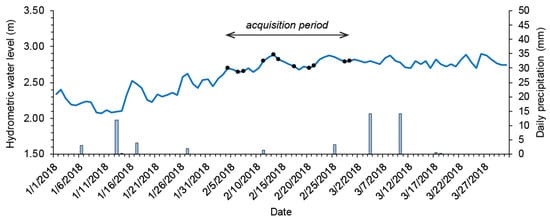 During the acquisition period, the hydrometric level measured at a water gauge on the Paraná River was similar and relatively low, and precipitation was not substantial (Figure 3). Wind speed at the time of the acquisitions ranged between 0 and 11 km·h−1, i.e., wind conditions were “calm” to “gentle breeze”. Based on this information, and provided that vegetation growth was negligible during February 2018, we assumed that backscattering changes between scenes were mostly related to incidence angles.