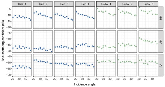 For the three polarizations, median backscattering coefficients were higher at Ludwigia targets than at Schoenoplectus targets (p < 0.0001). The overall trend for median backscattering coefficients was a decrease with incidence angles, both at Schoenoplectus and Ludwigia plots (Figure 4). Regarding co-polarizations, σ0HH was higher than σ0VV, especially at steep incidence angles (FQ_02), obtaining σ0HH-σ0VV differences of a maximum of 3.6 dB (minimum −1.74 dB, mean 0.53 dB) for Schoenoplectus and of a maximum of 4.4 dB (minimum −0.69 dB, mean 1.5 dB) for Ludwigia. Cross-polarization σ0HV was always lower than co-polarization, with maximum σ0HH-σ0HV differences of 17.2 dB (Schoenoplectus at FQ_08 scenes) and 14.6 dB (Ludwigia plots at FQ_08 and FQ_10).