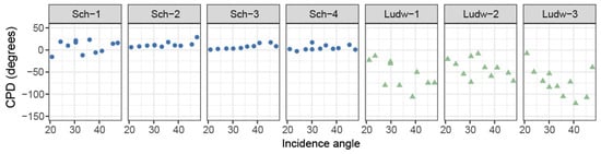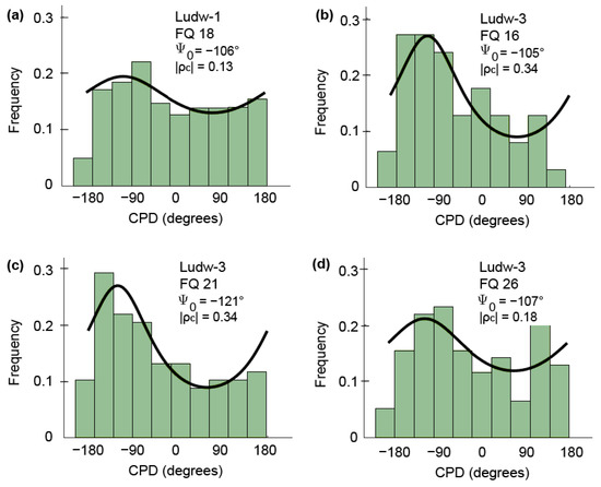Maximum likelihood estimations of co-polarized phase difference (CPD) , for CPD values significantly lower than zero. The estimations were obtained with Equation (2). Coherence is notated . Each subfigure shows a sampling site (see Table 2 for target description) and scene beam ordered by increasing incidence angle (see Table 1). (a) Ludw-1, FQ 18; (b) Ludw-3, FQ 16; (c) Ludw-3, FQ 21; (d) Ludw-3, FQ 26.
