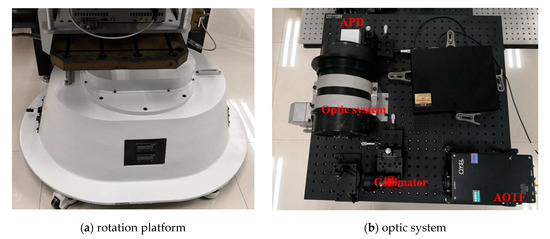 The system component and the working flow of the employed AOTF-HSL are presented in Figure 1; hardware prototype of the designed AOTF-HSL and the employed 2D rotation platform are shown in Figure 2. The HSL is assembled with several indispensable components, including the SC source, the wavelength selecting device or filtering component, the optical system, the reflected laser pulse detection module, and the data sampling and storing device. Specifications and particulars of these essential parts are given in detail as follows: