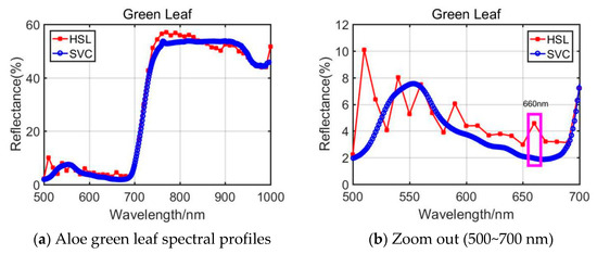 For the Dracaena green leaf, the difference of the TCI, NDERI, RVI, and FRI was larger; only NDERI was below 20%. As listed in Section 2, the spectral profiles covering 500~700 nm were included in the calculation of the TCI, NDERI, RVI, and FRI values, and the reflectance values from HSL and SVC were slightly different. The spectral profiles comparison is shown in Figure 4a,b. As presented in these figures, compared with the spectral profiles of 700~1000 nm, the 500~700 nm spectral reflectance was quite different.