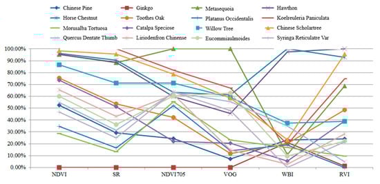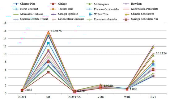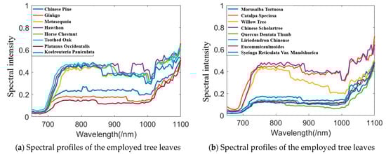 Figure 10 presents an example of scanning the leaf with HSL. The red point was the footprint of the HSL laser pulse. The collected spectral profiles of the sixteen different leaves are presented in Figure 10; the spectral profiles plotted in Figure 11a included the Chinese pine (Juniperus rigida), Ginkgo (Ginkgo biloba), Metasequoia (Metasequoia glyptostroboides), hawthorn (Crataegus pinnatifida), Horse chestnut (Aesculus hippocastanum), Toothes oak (Quercus), Platanus occidentalis, and Koelreuleria Paniculata. The spectral profiles of the left eight different leaves in Figure 11b included Morusalba Tortuosa, Catalpa speciose, Willow tree (Salix), Chinese scholartree (Styphnolobium japonicum), Quercus dentate Thunb, liriodendron chinense (Chinese Tulip Tree), Eucommiaulmoides, and Syringa reticulate var. mandshurica. Limited by the HSL working spectral coverage, the spectral profiles presented in Figure 11 were sampled ranging from 650 nm to 1100 nm. Another spectral parameter set (NDVI, SR, NDVI705, VOG, WI, and RVI) was extracted and presented. SR, NDVI705, and VOG were the new parameters different from that of the first experiment. The definitions and explanations were listed as the following Equations (23)–(25).