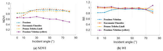 In this experiment, normalized difference vegetation index (NDVI) and water index (WI) were employed as the representative parameters of the “(A − B)/(A + B)” and “A/B” styles. NDVI and WI results of the Fraxinus velutina, Eucommia ulmoides, and Prunus triloba Lindl green leaves and Fraxinus velutina yellow leaf are presented in the Figure 14. A 100% whiteboard was employed as the reference to calculate these NDVI and WI results. As analyzed in the Section 2.2, the incident angle had no influence on the NDVI and WI results. In Figure 15, the incident angles were 0°, 10°, 20°, 30°, 40°, 50°, 60°, 70°, and 80°. The distance remained the same while measuring the whiteboard and these leaves. It could be seen that the NDVI and WI values varied at a limited range, which demonstrated that the incident angle almost had no influence on the NDVI and WI results.