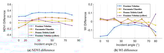 As aforementioned, an ASD FieldSpec 4 spectrometer was employed to collect the spectral profiles, which could be regarded as the reference. Figure 16 presents the difference results between the spectral parameters from the HSL and spectrometer. In aspects of the NDVI difference, Eucommia ulmoides and Prunus triloba Lindl green leaves and Fraxinus velutina yellow leaf NDVI difference were smaller than 0.2 at all the selected incident angles. In addition, the most of the WI difference results were smaller than 0.1.