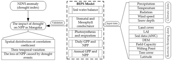 We used the MODIS NDVI and a process-based ecosystem model, namely the Boreal Ecosystem Productivity Simulator ((BEPS), Liu et al. [38]) to determine the response of NPP on drought events in Mongolia during 2003–2018. The objectives of this study were to (1) quantify the spatial and seasonal (growing season) variability of drought events, (2) examine the spatial and temporal variations in terrestrial NPP, (3) assess the impact of drought on NPP change, and (4) identify uncertainties and knowledge gaps associated with NPP estimation in Mongolia.