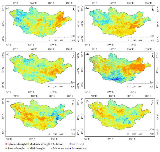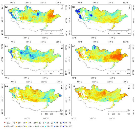 Spatial pattern of drought severity from 2003 to 2018 across Mongolia during periods experiencing the most drought: (a) May–September 2004, (b) May–September 2005, (c) May–September 2006, (d) May–September 2007, (e) May–September 2009, and (f) May–September 2017.