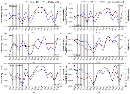 The temporal variations of NPP and droughts were also explored by Pearson’s correlation analysis between NPP and NDVI anomaly concerning accumulated and average values in the growing season for 2003–2018 (Figure 8). A slightly increasing trend in both NDVI anomaly and BEPS-derived NPP was observed across Mongolia. The calculated correlation coefficient between the growing season total NPP and mean NDVI anomaly was 0.61 (p < 0.001, n = 16). Meanwhile, the Pearson’s correlation coefficient of the NPP and the drought-affected area was −0.55 (r = −0.55, p < 0.001, n = 16), suggesting that drought was one of the factors for the decline in terrestrial NPP in Mongolia. We also quantified the contribution of drought to NPP in different vegetation types. Figure 8 illustrates the influence of droughts on vegetation productivity and accumulated NPP over different vegetation types during 2003–2018. The droughts reduced the grassland NPP in Mongolia (r = 0.64, p < 0.001) in the growing seasons of 2007, 2009, 2010, 2015, and 2017. For the forest, the correlation between NPP and NDVI anomaly was lowest (r = 0.39, p < 0.001) because trees have deeper roots and have access to groundwater. However, the droughts in the growing seasons of 2003, 2009, 2010, 2015, 2016, and 2017 reduced the forest NPP (Figure 8). The droughts reduced the growing seasonal NPP for the wetland (r = 0.70, p < 0.001) in 2008, 2009, and 2012; for sparse vegetation (r = 0.74, p < 0.001) in 2004, 2005, 2007, 2009, 2015, and 2017; and for shrubland vegetation (r = 0.52, p < 0.001) across Mongolia in 2009, 2015, and 2017 (Figure 8).