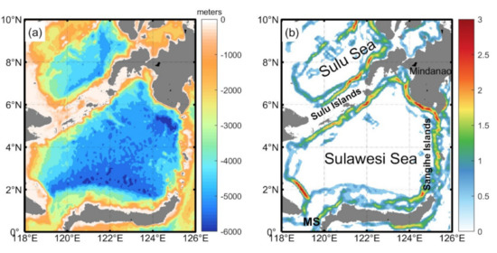(a) Bathymetry of the Sulu-Sulawesi Seas. (b) Slope criticality γ/c. (c = [(ω2 − f2)/(N2 − ω2)]1/2), which indicates the internal tide propagation angle to the horizontal, and γ is the bottom gradient.) The study region area is 0° to 10°N, 118° to 126°E near the equator. MS: Makassar Strait. The Sulawesi Sea is semi-closed, connected with the Makassar Strait to the south and the Western Pacific to the east. The Sulu Island chain forms the southern edge of the Sulu Sea and the northern edge of the Sulawesi Sea.