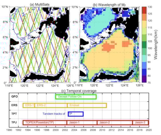 In this paper, we used the sea surface height (SSH) observations combined by multiple altimeter satellites, including TOPEX/Poseidon (TP), Jason 1, 2, and 3 (J1, J2, and J3), Geosat Follow-On (GFO), Envisat (EN), and European Remote Sensing Satellite 1 and 2 (ERS-1 and ERS-2). The satellites usually take over and continue the previous satellite missions. Thus, a series of satellites have the same parameters, including the ground track and the repeated cycle (Figure 2a). According to satellite ground tracks, the SSH data are divided into four sets, namely TPJ (TP, J1, J2, and J3), TPT (TP tandem mission), ERS (ERS-1 and ERS-2), and GFO (Figure 2c). Standard corrections for geophysical effects, surface wave bias, and atmospheric effects are applied to process the SSH measurements. Global Ocean Tide 4.7 (GOT4.7) was used to correct the barotropic tide and loading tide. The noise measurement error on the same scale in different satellites is less than the amplitude of internal tides in our survey region. Our study area extends from 118°E, 0° to 126°E, 10°N to contain the Sulu-Sulawesi Seas. To avoid the issues of tide aliasing in marginal seas caused by satellite altimetry measurements, measurements of water depths less than 400 m were eliminated. The reference depth is determined based on the sensitivity analysis of different depths. The setting of a threshold is necessary because the quality of satellite altimeter data in coastal areas is not good enough. The Copernicus Marine and Environment Monitoring Service (CMEMS) is responsible for processing and distributing SSH measurements. The satellite SSH products were downloaded on 16 July 2020. A global mode-1 M2 internal tide field was constructed using a similar dataset [8].