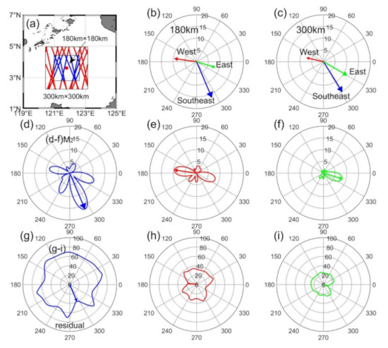 An example is shown in Figure 3 to illustrate the process of extracting mode-1 M2 internal tides. Internal tides are extracted using over 1 × 105 SSH data in a selected window centered at 3.6°N, 121.8°E (Figure 3a). First, using the least-square fitting, the amplitude and phase of a plane-wave are determined in each compass direction with a 1° angular resolution. When we plotted the amplitudes in polar coordinates as a function of direction, the lobes appeared and indicated the internal tidal beams. The amplitude and direction of the first M2 internal tide are determined by the largest lobe (Figure 3d). Then, the phase and direction corresponding to the maximum amplitude is determined. The amplitude maximum corresponds to the residual minimum in the same direction (Figure 3g). When the first internal tide wave is identified, its signal can be reproduced and then removed from the original measurements. The extraction process above is repeated (Figure 3e,f). The residual variance also varies with the direction (Figure 3g–i). The new maximum amplitude tidal wave can then be considered as another tidal wave direction. In this study, five internal tidal waves are extracted in a fitting window of 180 km by 180 km at each grid point, based on a sensitivity analysis of different sizes (Figure 3b,c). The size of the window is about one and a half wavelength of mode-1 M2 internal tides in the Sulu-Sulawesi Seas. The last two internal tide waves are too small, so only the first three waves are presented in Figure 3.