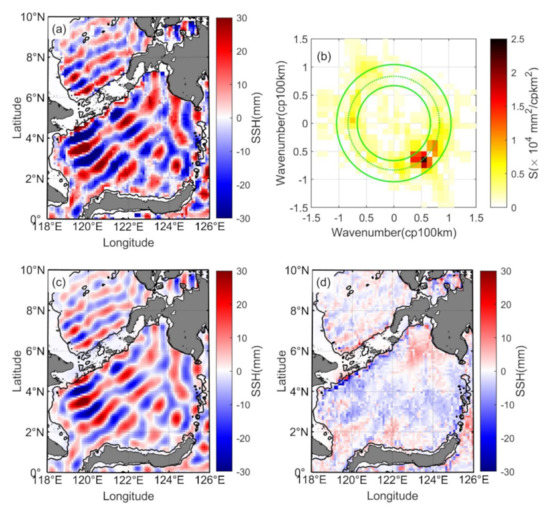 The nontidal noise in the M2 internal tide field is removed by a 2-D band-pass filter (Figure 4). It processes the internal tide field by preserving the internal tides that meet the theoretical wavelengths. Figure 4b shows the two-dimensional wavenumber spectrum conducted by processing the noisy internal tide field on a regular spatial grid. It shows a nearly circular energy pattern indicated by a dotted circle corresponding to a wavenumber of 8 × 10−3 cpkm for the mode-1 M2 internal tide. Its reciprocal corresponds to the theoretical wavelength (Figure 2b). Ray and Zaron [29] constructed a global map of modal wavelengths by applying a two-dimensional wavenumber spectrum. The cutoff wavenumbers are indicated by solid circles, which are chosen as [4/5 8/5] times the theoretical wavenumber. Figure 4c shows 2-D band-pass filtered internal tide field with a smooth pattern. Figure 4d gives a residual field representing the nontidal noise acquired from the difference between Figure 4a,c. Because the wavenumber varies more dramatically in small basins, the wavenumber band is broader than the similar band shown by Zhao [22], who fully demonstrated that the 2-D filter does not lead to blind directions. The results will be discussed in Section 3.1.