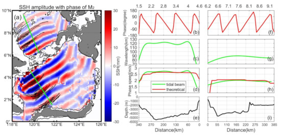 The green lines suggest the propagation paths of two M2 beams in the Sulu- Sulawesi Seas. The along-beam phase speed of M2 internal tide is examined by comparing the theoretical and altimetric results. Many factors affect the phase speed, including the depth and latitude. We calculated these factors along the two green lines, and the calculation procedure is illustrated in Figure 6b–i. First, the along-beam phase usually increases with the propagation distance in the Sulu-Sulawesi Sea, respectively (Figure 6b,f). Then, the polynomial fitting is employed to smooth the along-beam phase. The wavelength is calculated from the relation of phase gradient to distance (Figure 6c,g). The graphs show that the wavelength is mainly affected by the basin’s depth rather than the Coriolis parameter near the equator. Finally, the phase speed is deduced from the relation of frequency and wavelength (Figure 6d,h). For comparison, light green curves indicate the theoretical phase speeds extracted from WOA2018 [31]. Due to the rapid decrease in the depth of submarine topography, the low values of the theoretical phase speed appear at starting and ending points (Figure 6e,i); meanwhile, the satellite-derived phase speeds coincide with the theoretical phase speeds.